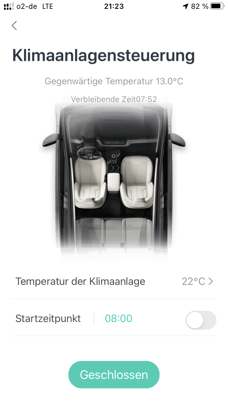Zum Thema App und Vorklimatisierung, die läuft bei Aktivierung nur 10 min. und schaltet dann ab. Hatte bei mir letztens genügt um von 12° auf 18° Zu kommen… das muss besser werden im Winter um den Wagen zu enteisen.