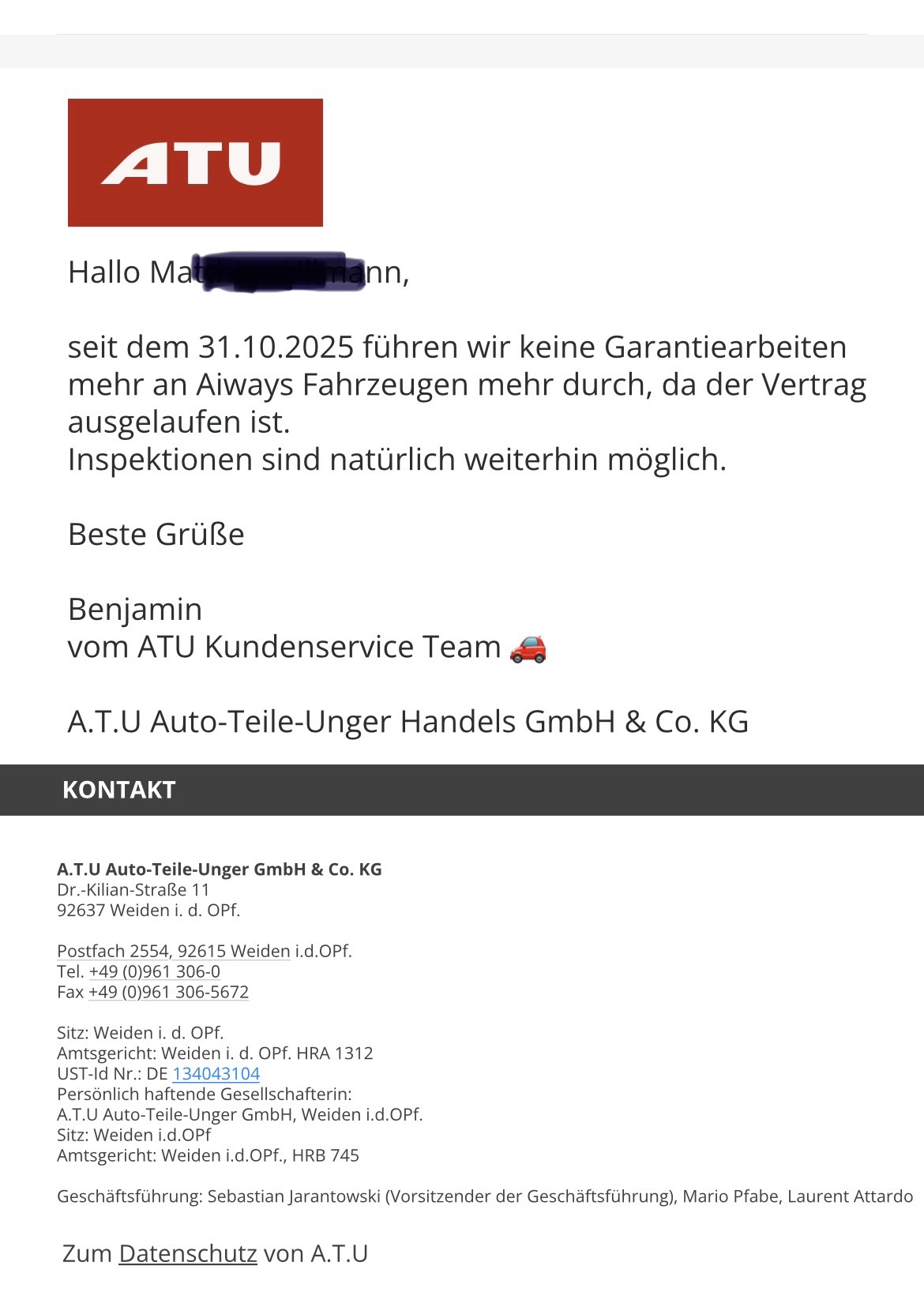 Hallo, ich hatte gerade ein unerfreuliches Gespräch mit der ATU Zentrale.