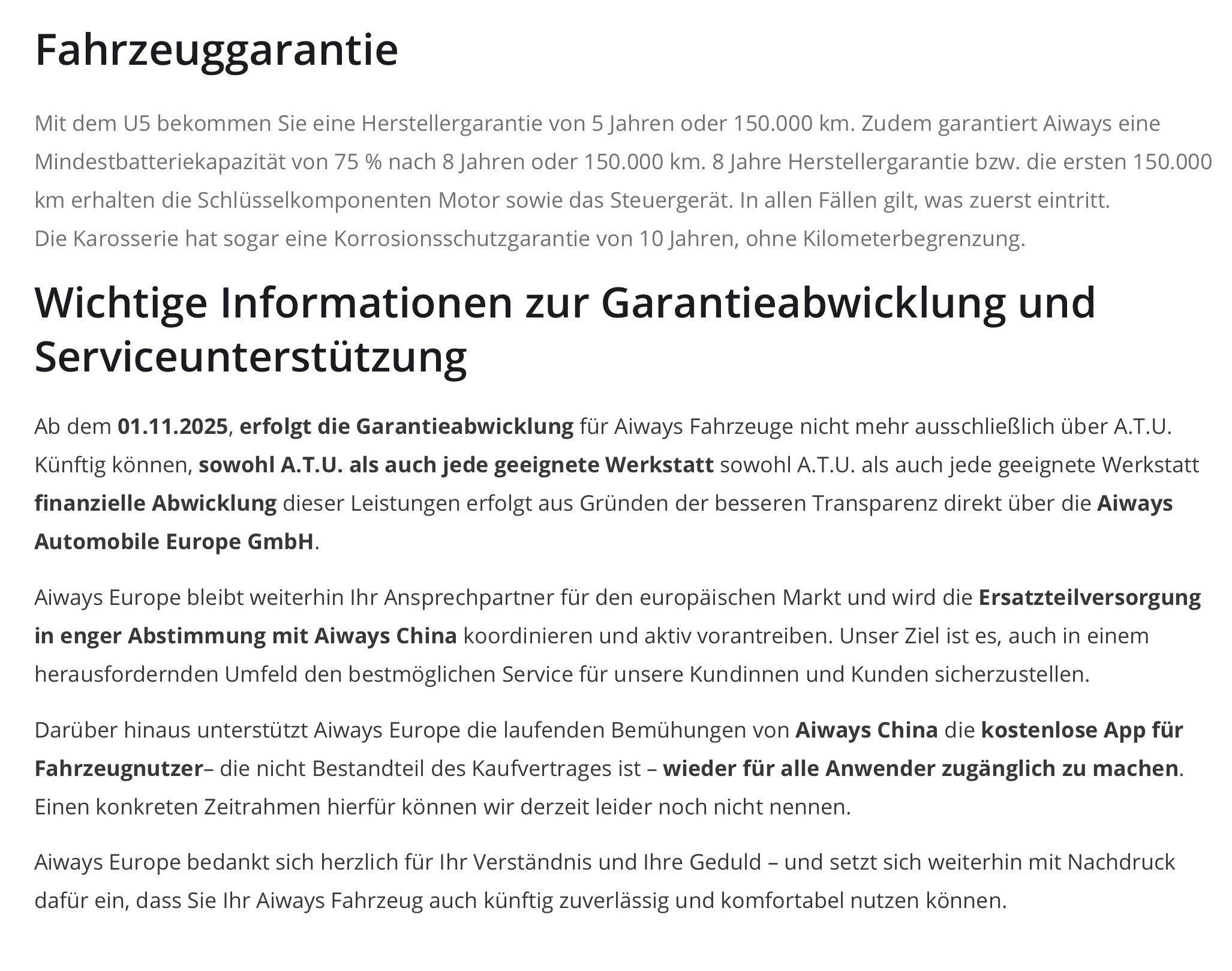Ab dem 01.11.2025, erfolgt die Garantieabwicklung für Aiways Fahrzeuge nicht mehr ausschließlich über A.T.U. Künftig können, sowohl A.T.U. als auch jede geeignete Werkstatt sowohl A.T.U. als auch jede geeignete Werkstatt finanzielle Abwicklung dieser Leistungen erfolgt aus Gründen der besseren Transparenz direkt über die Aiways Automobile Europe GmbH.