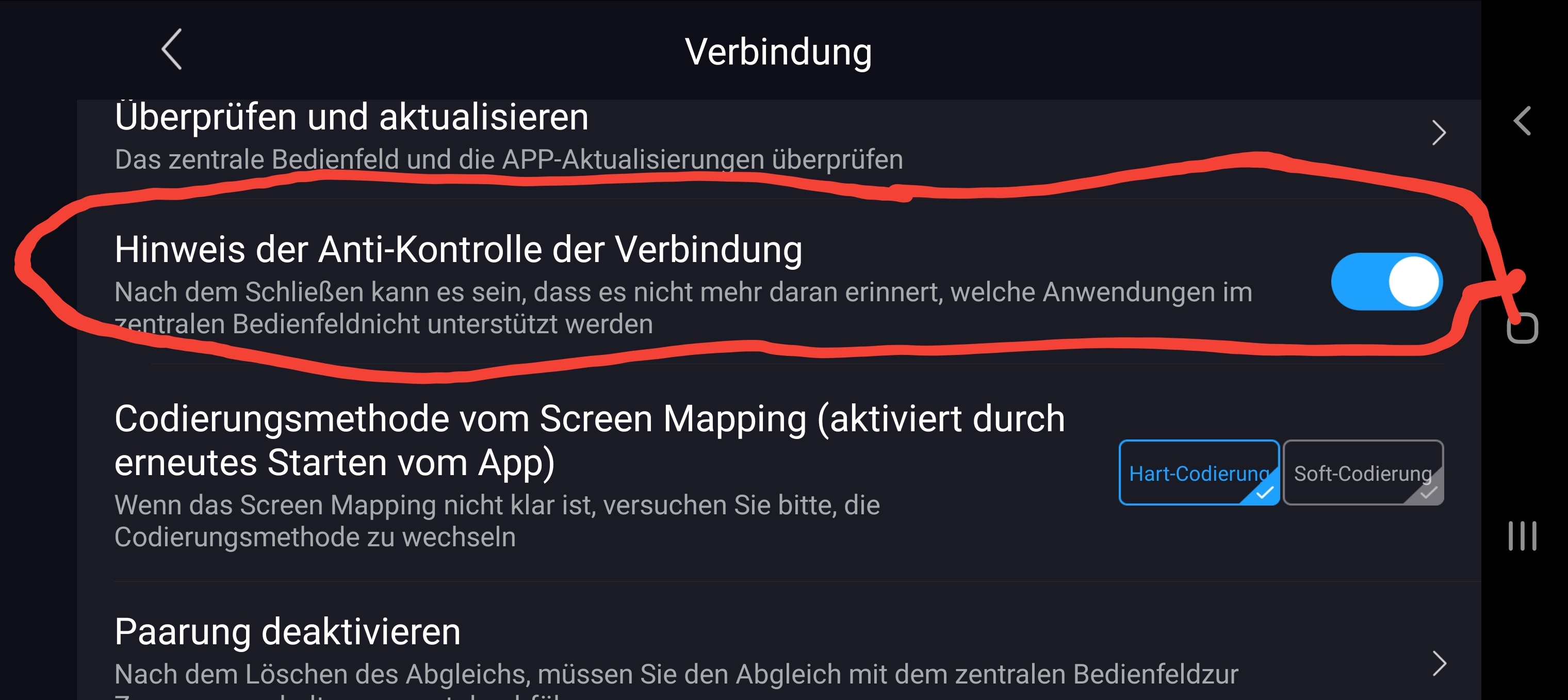 Zitat von A380 am 28. März 2021, 14:07 UhrHmm...wie dem auch sei: Fakt ist, dass die Easycon App zur Zeit kaum zu benutzen ist. Weder ABRP noch Waze noch Maps oder Android Auto bekomme ich auf dem Autodisplay ans Laufen. Nur der Eingangsbildschirm der App ist zu sehen. Sobald ich auf eine Naviapp umschalte, bekomme ich den schwarzen Bildschirm mit der Meldung, die Spiegelung sei nicht erlaubt. Ich denke, der Fehler liegt bei Android. Am Auto und an der App habe ich nichts verändert. Aber das Handybetriebssystem verändert sich ja laufend und selbstständig. Da müssen die Macher der App noch mal in die Spur und ihre App an das neue Android anpassen.